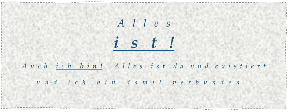 Die Grundhaltung des SEINS ist im Grunde konträr zum in unserer westlichen Kultur dominierenden Materialismus und entspricht etwa der ostasiatischen Geisteshaltung des „ZEN“, die im Verlauf des letzten Jahrhunderts auch im Westen bekannt wurde: eine Haltung, die in dem, was der Augenblick gerade erfordert, ganz aufgeht, - gleichgültig, um welche Tätigkeit des Alltags es sich handelt … Eine Haltung entsteht, die empfänglich ist für „die Schönheit des Augenblicks“: