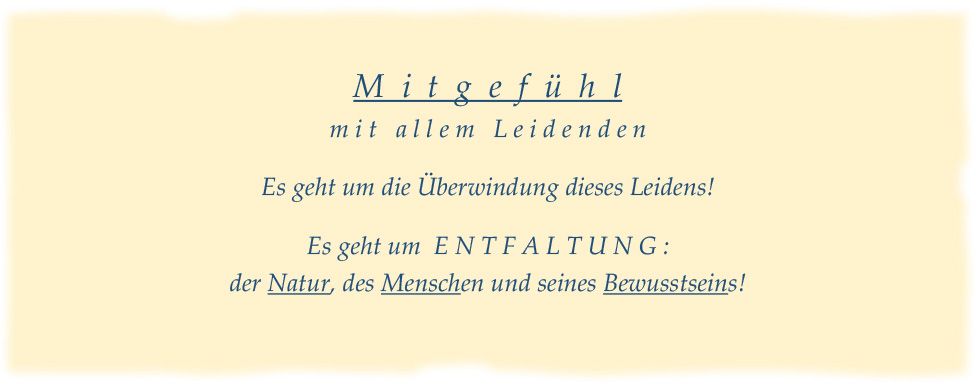 Da wir in einer Welt leben, in der sich das LEID unserer Mitgeschöpfe und unserer Mitmenschen nicht übersehen lässt, erschließt sich hier der Zugang zu einer Bewusstseinsstufe, die zwar in uns unterschiedlich stark ausgeprägt und entwickelt ist, die aber über die genetisch begründete Befähigung: