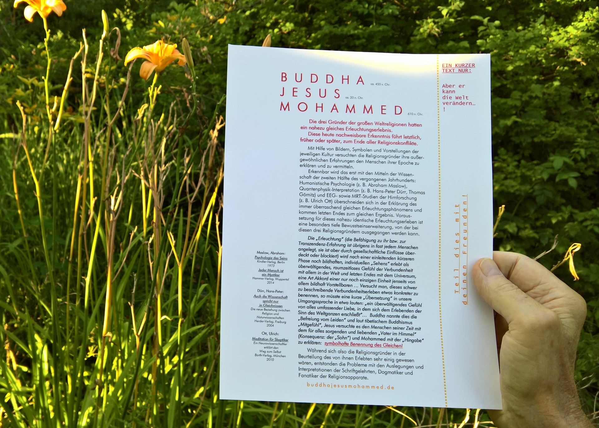 Ich erwähnte, dass in der Beschäftigung mit dem Thema der inzwischen möglichen Erklärungen der Transzendenz-Erfahrungen die Parallelität der Erleuchtungserlebnisse der großen Religionsgründer irgendwann auffallen muss. Zu diesem Thema stellte ich 2019 die Webseite www.buddhajesusmohammed.de ins Internet, die in knapper Form das Wesentliche hierzu zu vermitteln versucht..