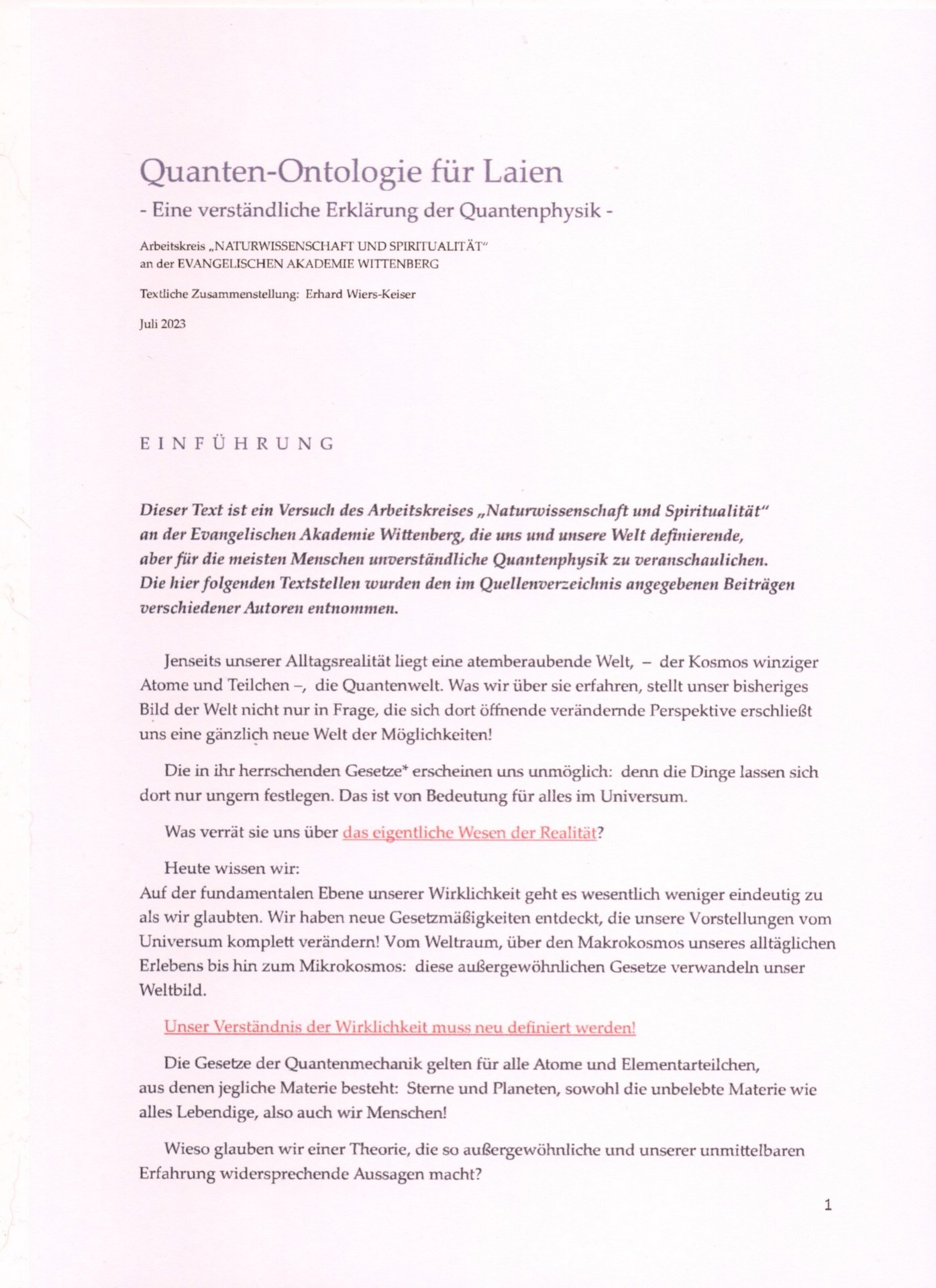 Arbeitskreis „Naturwissenschaft und Spiritualität“ der Evangelischen Akademie Wittenberg